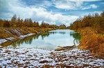 The last picture of the lake captures a serene winter scene where everything seems to be wrapped in a plush blanket of snow. The landscape is transformed into a dreamy wonderland, with soft whites and icy blues dominating the canvas. The water, usually sparkling and lively, lies still beneath the shimmering frost, mirroring the cloud-covered sky that's heavy with hues of gray. Frost-kissed trees stand like silent sentinels along the shore, their branches heavily laden with snow, making them look almost like sculptures frozen in time.